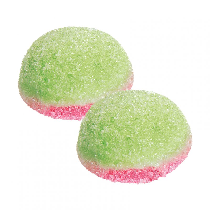 Un bonbon gélifié saveur psatèque semi-circulaire de couleur rouge et verte et à la texture double. Ces bonbons en forme de pastèque gélifiés ont un enrobage sucré avec du picant et un remplissage qui fondra dans votre bouche lorsque vous en mangerez un. Délicieux !